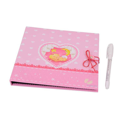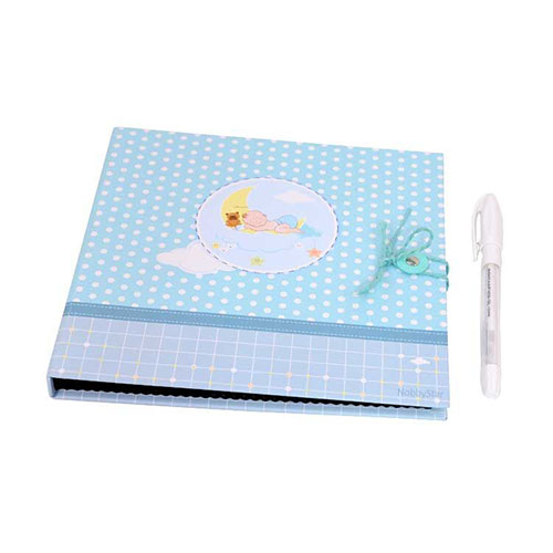 Sert mukavva malzemeden üretilmiş, ön kapak kısmında uykucu bebek figürü bulunan, 12 yaprak bebek anı defteri.